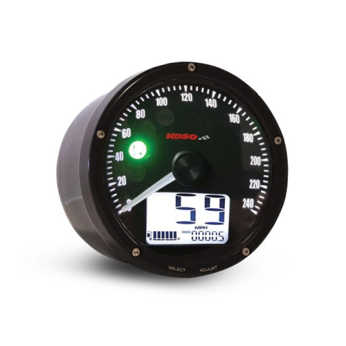 Easy-to-read display. Range of 0-140 km/h or 0-360 km/h, depending on model; adjusts to mph. Effective temperature range -10 °C – +60 °C. Five adjustable backlight settings. Measures 85,5 mm (3,36″) at gauge face, 79,5 mm (3,12″) for gauge body.
