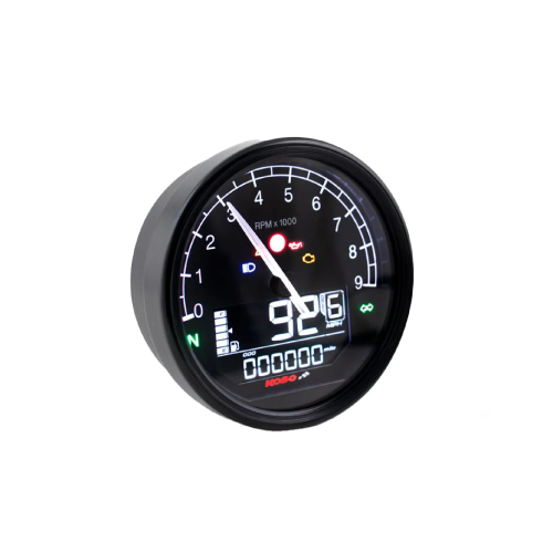 Speedometer and rev counter with multiple functions. Speedometer display range 0-360 km/h (0-225 mph) switchable with display unit 1 km/h (mph). Exceeding the maximum speed limit warning setting range 30-360 km/h (19 ~ 225 miles/h). When previously set value is reached/exceeded, warning light flashes. With setting unit 1 km/h (mph). Odometer display range 0-999.999 km (miles) with display unit 1 km (mile). Trip meter A/B display indication 0-999.999 km (miles) with display unit 0.1 km (miles). Oil change interval setting range Off / 500 – 16,000 km (300 – 10,000 miles) with setting unit of 100 km (miles). Fuel gauge display range 100, 250, 270, 510, 1200, SW, User with display unit of 6 bars that indicate how full the tank is. Tyre percentage setting range 50 – 200% with adjustment unit of 1%. Gear indicator display range (No indication), N, 1, 2, 3, 4, 5, 6 indicates a shift recommendation as soon as a speed range has been exceeded. Shift flash with setting range of 1,000 – 8,000 RPM when the previously set range is exceeded the shift flash appears. Digital tachometer display range 0 – 8,000 RPM with display unit of 100 RPM. Thermometer with display unit of °C or °F (switchable). Water thermometer display range -30 – 255°C (-22 ~ 437°F) with display unit of 1°C (°F). Voltmeter display range 8 – 18 volts. Clock setting range 12 / 24 hour format. Indications on the dial include, Warning light 1, Warning light 2, Speed flash, Idle (N), Indicator light, High beam and Engine warning light. Type of warnings Light (L), Slow flash (S) and Flash (F). Low voltage indicator setting range 8.0 – 18.0 V. Background brightness setting range 1 – 5 (darkest) – 5 – 5 (brightest) with setting unit of each level (1-5) = 20%. 7 selectable background colors, Purple, Red, Yellow, Green, Blue, Light blue and White. Voltage DC 12V. Size 94.7 x 94.7 x 69.2 mm.